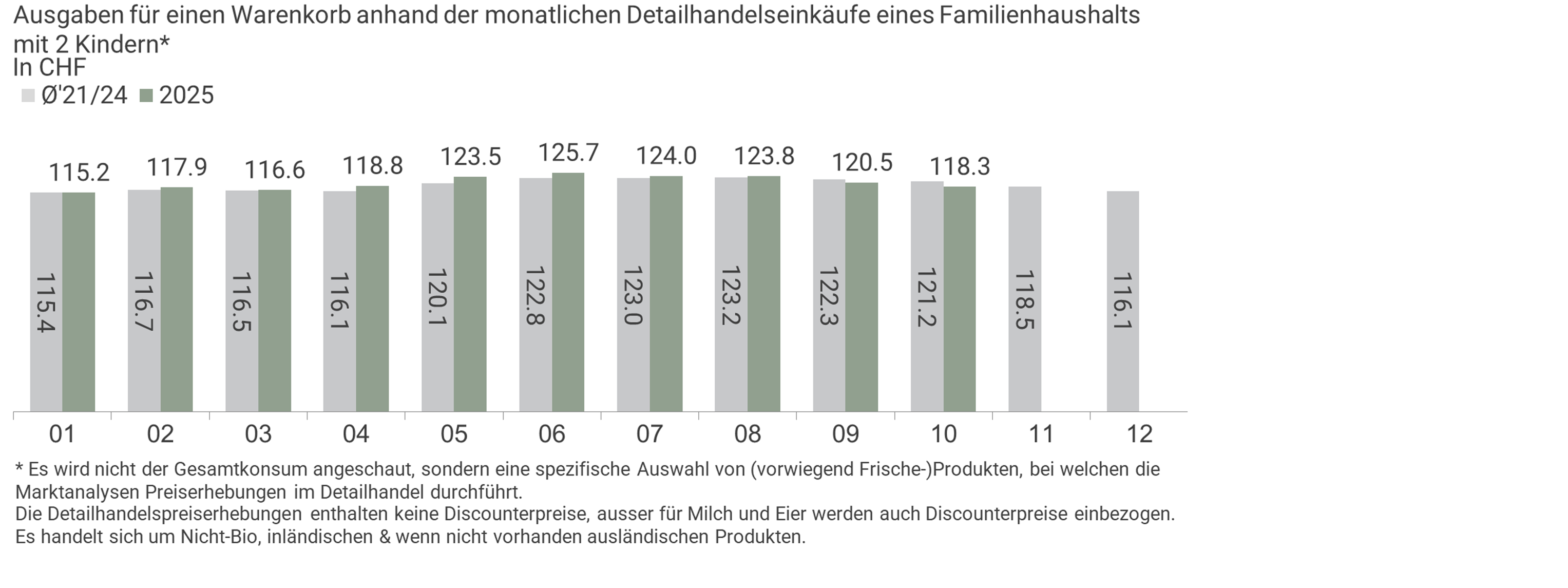 Der Fachbereich Marktanalysen des BLW beobachtet monatlich die Kosten für einen Warenkorb, der dem monatlichen Bedarf an ausgewählten Lebensmitteln eines Familienhaushalts mit zwei Kindern entspricht. Dabei wird nicht der Gesamtkonsum angeschaut, sondern eine spezifische Auswahl von Produkten, welche aus landwirtschaftlicher Sicht bedeutsam sind und für welche ganzjährig Bio und nicht-Bio Preisdaten verfügbar sind.